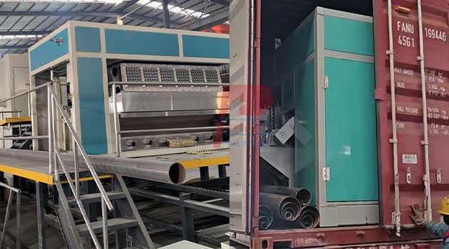 2023.12.6, Poland client purchased 7000 pieces per hour automatic paper pulp egg tray making machine finished shipment, the whole line consists of waste paper recycling pulping system, 6-8 automatic egg tray molding machine, multi-layer metal oven dryer, automatic egg tray collection stacker, vacuum system and air compressor system.