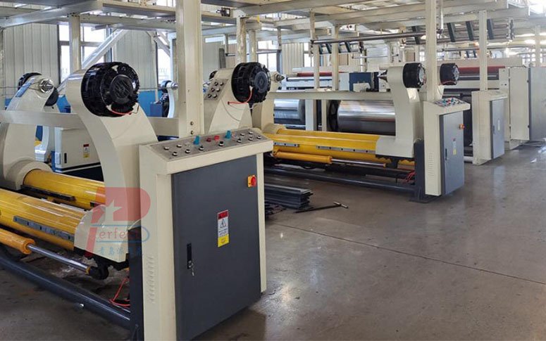 One complete corrugated cardboard production line consists of the "wet part" (covering the process from raw paper feeding to bonding and forming) and the "dry part" (covering the process from setting/curing to cutting and stacking).