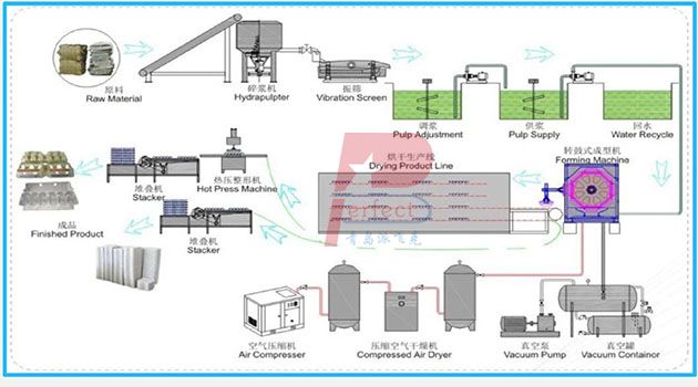 Feed the cleaned raw waste paper and old cardboards into the hydrapulper to recycle into paper pulp, then the pulp will be supplied to the molding machine by the pulp pumps, and egg tray forming machine will do vacuum absorption to form the egg tray under the vacuum tank and air compressor’s assistance, then labor taking the finished egg tray onto drying frames and pallets for sunshine drying or match single or multi-layer metal dryer for automatic drying ( diesel oil or natural gas as fuel); Brick dryer use coal without smoke can be designed also.